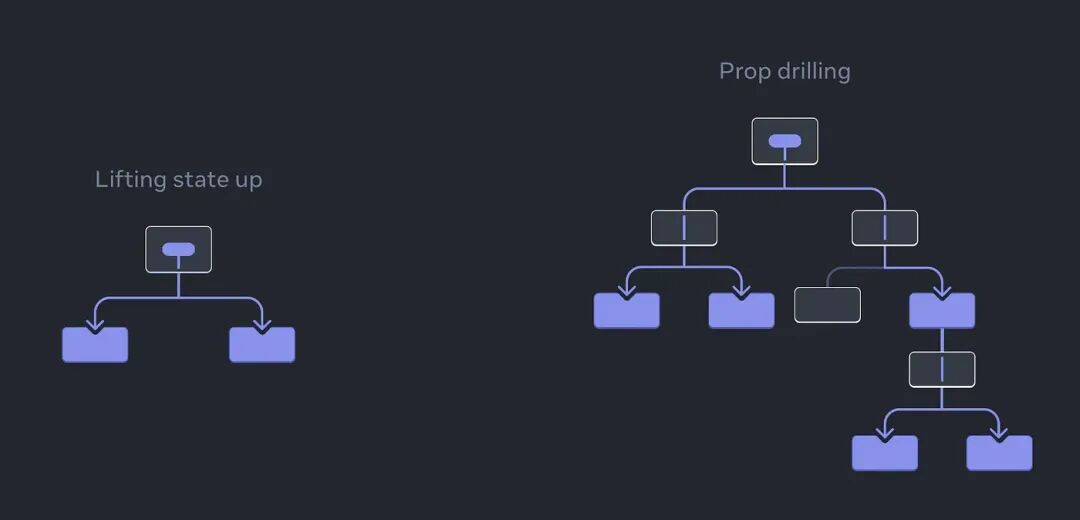 再更复杂一点的时候,不同层级的组件或是多层级的组件需要共用状态,根据 lifting state up 的规则,状态被不断地被往上提之后,状态会在多层的组件之间传递,这便是 props drilling 的问题。