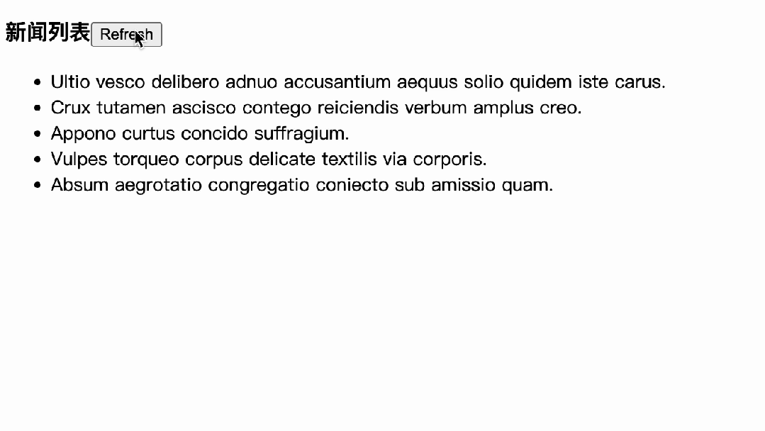 import * as React from 'react';import { useState, use, Suspense } from 'react';import { faker } from '@faker-js/faker';export const App = () => { const [newsPromise, setNewsPromise] = useState(() => fetchNews()); const handleUpdate = () => { fetchNews().then((news) => { setNewsPromise(Promise.resolve(news)); }); }; return ( <> <h3> 新闻列表 <button onClick={handleUpdate}>刷新</button> </h3> <NewsContainer newsPromise={newsPromise} /> </> );};let news = [...new Array(4)].map(() => faker.lorem.sentence());const fetchNews = () => new Promise<string[]>((resolve) => // 使用 setTimeout 模拟数据获取 setTimeout(() => { // 每次刷新时添加一个标题 news.unshift(faker.lorem.sentence()); resolve(news); }, 1000) );const NewsContainer = ({ newsPromise }) => ( <Suspense fallback={<p>请求中...</p>}> <News newsPromise={newsPromise} /> </Suspense>);const News = ({ newsPromise }) => { const news = use<string[]>(newsPromise); return ( <ul> {news.map((title, index) => ( <li key={index}>{title}</li> ))} </ul> );};在上面的例子中,将商品添到购物车时,会先在购物车列表看到刚刚添加的商品,而不必等到数据请求完成。这样,用户可以更快地看到更新后的购物车内容,提供更加流畅的用户体验。