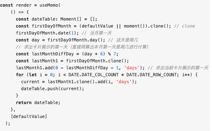 DatePicker 组件每次打开或者切换月份的时候,都需要大量的计算来算出当前需要展示哪些日期。然后再将计算后的结果渲染到单元格里面,这里可以使用 useMemo 来缓存,只有当传入的日期变化时才去计算。
