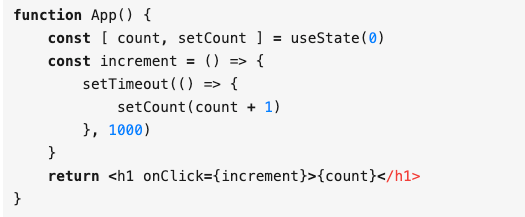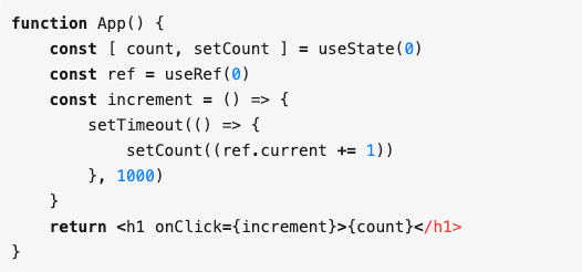 在 function component 里面每次更新都是重新执行当前函数,也就是说 setTimeout 里面读取到的 count 是通过闭包获取的,而这个 count 实际上只是初始值,并不是上次执行完成后的最新值,所以最后只加了 1 次。