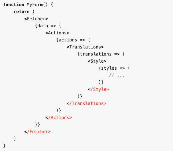 不管是 render props 还是高阶组件,他们要做的都是实现状态逻辑的复用,可这俩是完美的解决方案吗?考虑一下,如果我们依赖了多个需要复用的状态逻辑的时候,该怎么写呢?以 render props 为例: