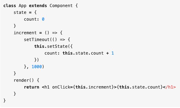 class 组件里面可以通过 this.state 引用到 count,所以每次 setTimeout 的时候都能通过引用拿到上一次的最新 count,所以点击多少次最后就加了多少。