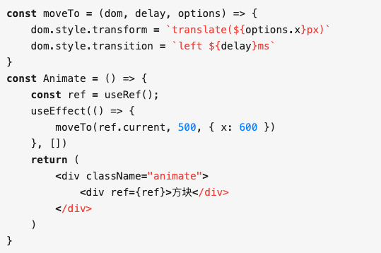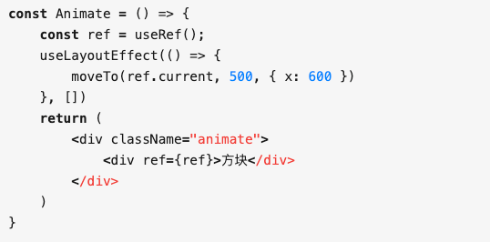 在 useEffect 里面会让这个方块往后移动 600px 距离,可以看到这个方块在移动过程中会闪一下。但如果换成了 useLayoutEffect 呢?会发现方块不会再闪动,而是直接出现在了 600px 的位置。