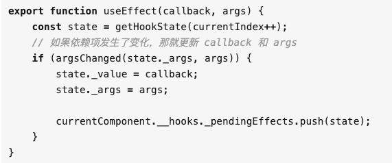 useEffect 和 useState 差不多,区别就在 useEffect 接收的函数会放到一个 _pendingEffects 里面,而非 _list 里面。