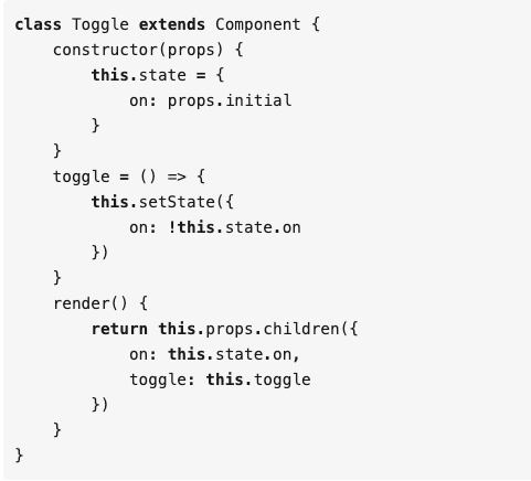 将函数作为 props 传给父组件,父组件中的状态共享,通过参数传给函数,实现渲染,这就是 render props。使用 render prop 的库有 React Router、Downshift 以及 Formik。以下面这个 Toggle 组件为例子,我们一般可以这样用: