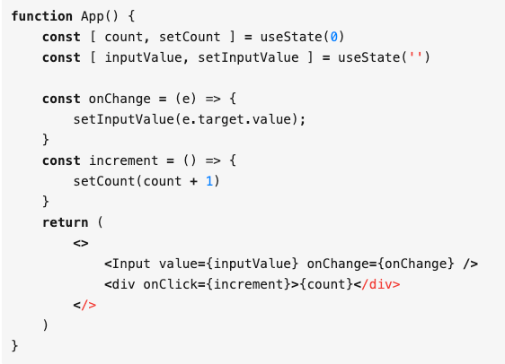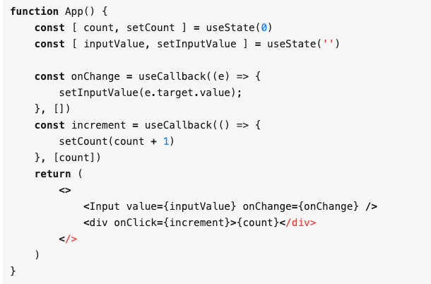 在函数组件里面,同样会有这个传递新的匿名函数的问题。从下面这个例子来看,每次点击 div,就会引起 Counter 组件重新渲染。这次更新明显和 Input 组件无关,但每次重新渲染之后,都会创建新的 onChange 方法。这样相当于传给 Input 的 onChange 参数变化,即使 Input 内部做过 shadowEqual 也没有意义了,都会跟着重新渲染。原本只想更新 count 值的,可 Input 组件 却做了不必要的渲染。