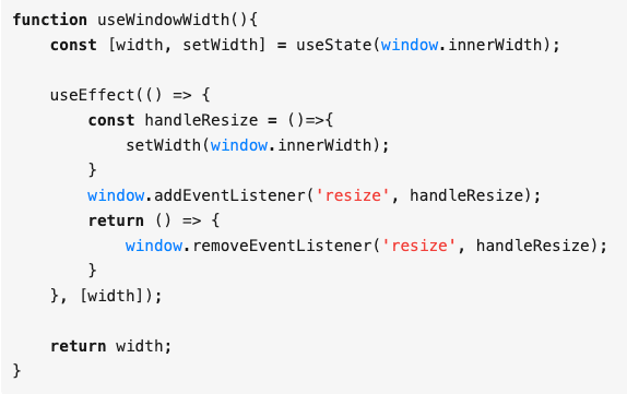 上面是一个结合了 useState 和 useEffect 两个 hook 方法的例子,主要是在 resize 事件触发时获取到当前的 window.innerWidth。这个 useWindowWidth 方法可以拿来在多个地方使用。常用的 Hook 方法如下: