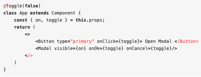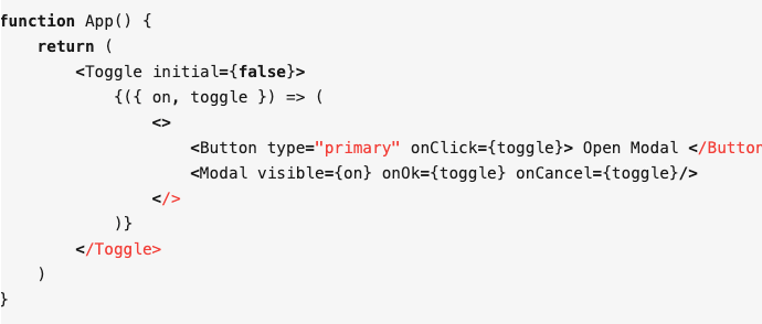 可以看到,控制 Modal 组件是否展示的状态被提取到了 Toggle 组件中,这个 Toggle 组件还可以拿来多次复用到其他组件里面。那么这个 Toggle 是怎么实现的呢?看到实现后你就会理解 render props 的原理