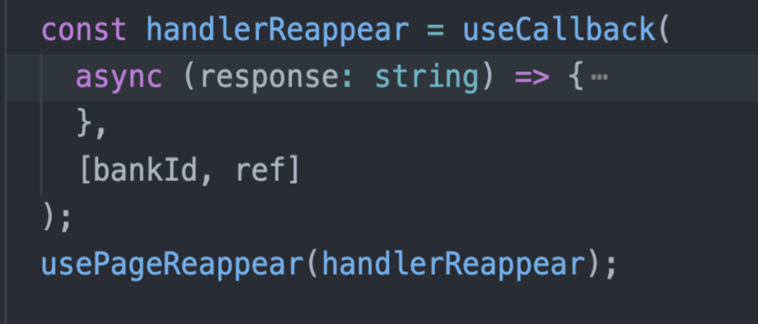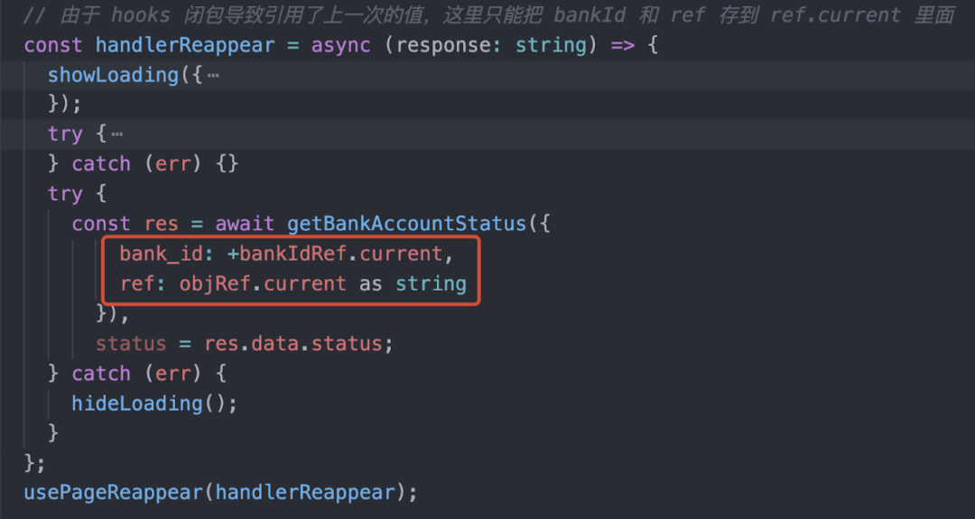 但是呢,这个 handlerReappear 方法需要在第一次进入页面的时候,向 JS Bridge 注册的事件,这就导致了一个问题,不管后来 handlerReappear 如何变化,registerHandler 里面依赖的 callback 都是第一次的,这也是闭包导致的问题。当然,你可能会说,我在 useEffect 里面也指定了依赖不好吗?但要注意这是个注册事件,意味着每次我都要清除上一次的事件,需要调用到 JS Bridge,在性能上肯定不是个好办法。