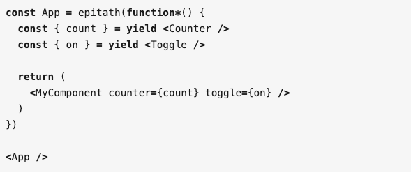 社区里面也已经有很多解决 render props 嵌套的方案,其中 Epitath 提供了一种以 generator 的方法来解决嵌套问题,利用 generator 实现了伪同步代码。