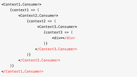新版 Context 常常有一个提供数据的生产者(Provider),和一个消费数据的消费者(Consumer),我们需要通过 Consumer 来以 render props 的形式获取到数据。如果从祖先组件传来了多个 Provider,那最终就又陷入了 render props 嵌套地狱。