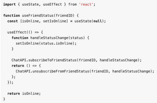 对于 react 来说,在函数组件中使用 state 固然有一些价值,但最有价值的还是可以编写通用 custom hooks 的能力。想像一下,一个单纯不依赖 UI 的业务逻辑 hook,我们开箱即用。不仅可以在不同的项目中复用,甚至还可以跨平台使用,react、react native、react vr 等等。编写自定义 hook 也需要以 use 开头,这样保证可以配合 eslint 插件使用。在 custom hooks 中也可以调用其他 hook,当前的 hook 也可以被其他 hook 或者组件调用。以官网上这个获取好友状态的自定义 Hook 为例: