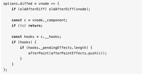 在 diff 结束之后会从 _pendingEffects 里面取出来函数一个个执行。afterPaint 里面使用了 requestAnimateFrame 这个方法,所以传给 useEffect 里面的方法是在浏览器绘制结束之后才会执行的。