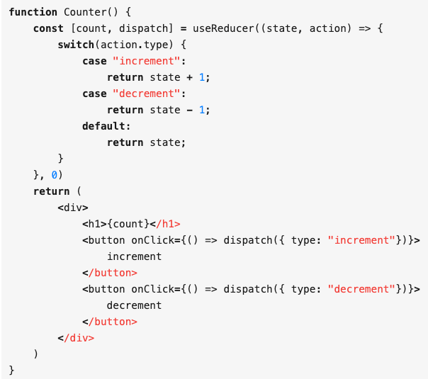 useReducer 和 useState 的用法很相似,甚至在 preact 中,两者实现都是一样的。useReducer 接收一个 reducer 函数和初始 state,返回了 state 和 dispatch 函数,常常用于管理一些复杂的状态,适合 action 比较多的场景。