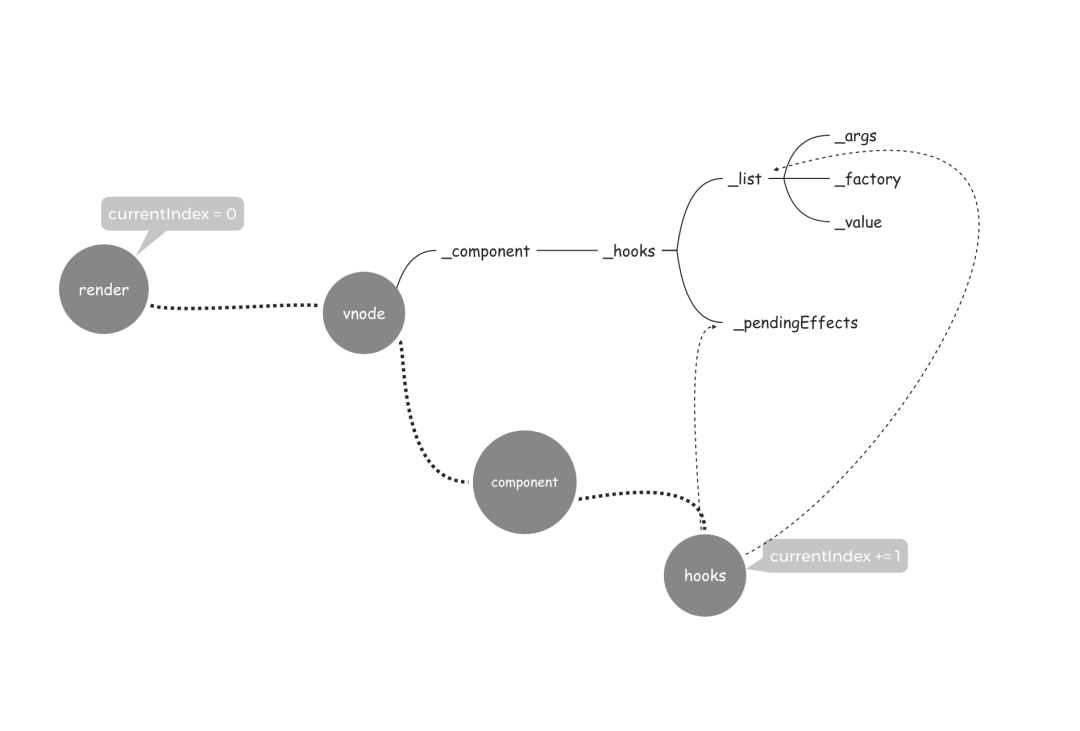 currentComponent._hooks._list中,且 currentIndex 加一。每次渲染进入一个组件的时候,都会从将 currentIndex 重置为 0 。遇到 hooks 方法时,currentIndex 重复第二步。这样可以把 currentIndex 和