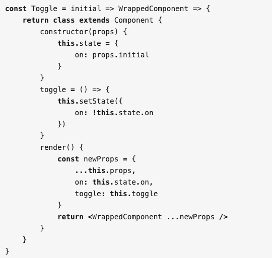 higher-order components 一般简称 hoc,中文翻译为高阶组件。从名字上就可以看出来,高阶组件肯定和高阶函数有什么千丝万缕的关系。高阶组件的本质是一个高阶函数,它接收一个组件,返回一个新的组件。在这个新的组件中的状态共享,通过 props 传给原来的组件。以刚刚那个 Toggle 组件为例子,高阶组件同样可以被多次复用,常常可以配合装饰器一起使用。