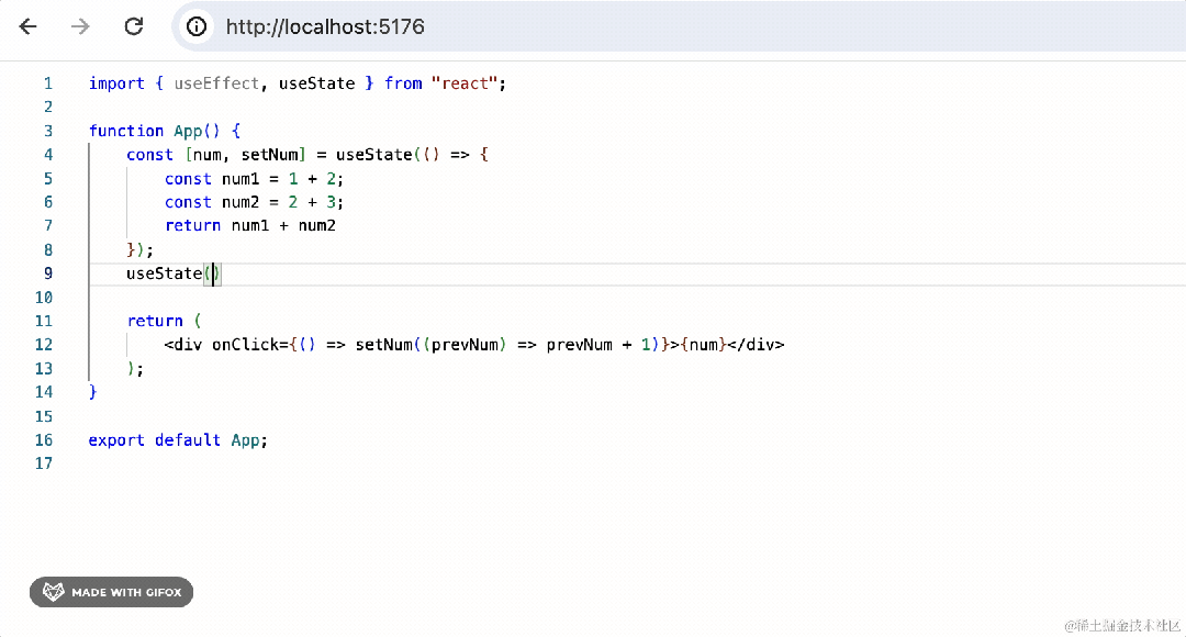 import Editor from '@monaco-editor/react';function App() { const code =`import { useEffect, useState } from "react";function App() { const [num, setNum] = useState(() => { const num1 = 1 + 2; const num2 = 2 + 3; return num1 + num2 }); return ( <div onClick={() => setNum((prevNum) => prevNum + 1)}>{num}</div> );}export default App;`; return <Editor height="500px" defaultLanguage="javascript" defaultValue={code} />;}export default App;Editor 有很多参数,等用到的时候再展开看。