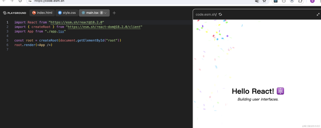 对于 react、react-dom 这种包,用 import maps 配合 esm.sh 网站来引入。
