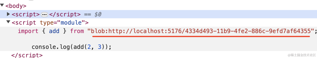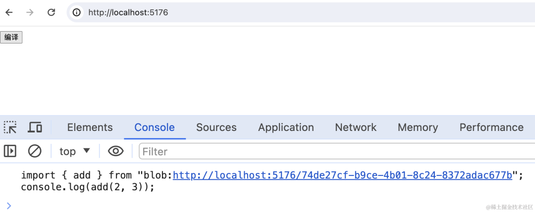 <!DOCTYPE html><html lang="en"><head> <meta charset="UTF-8"> <meta > <title>Document</title></head><body><script> const code1 =` function add(a, b) { return a + b; } export { add }; `; const url = URL.createObjectURL(new Blob([code1], { type: 'application/javascript' })); const code2 = `import { add } from "${url}"; console.log(add(2, 3));`; const script = document.createElement('script'); script.type="module"; script.textContent = code2; document.body.appendChild(script);</script></body></html>浏览器访问下: