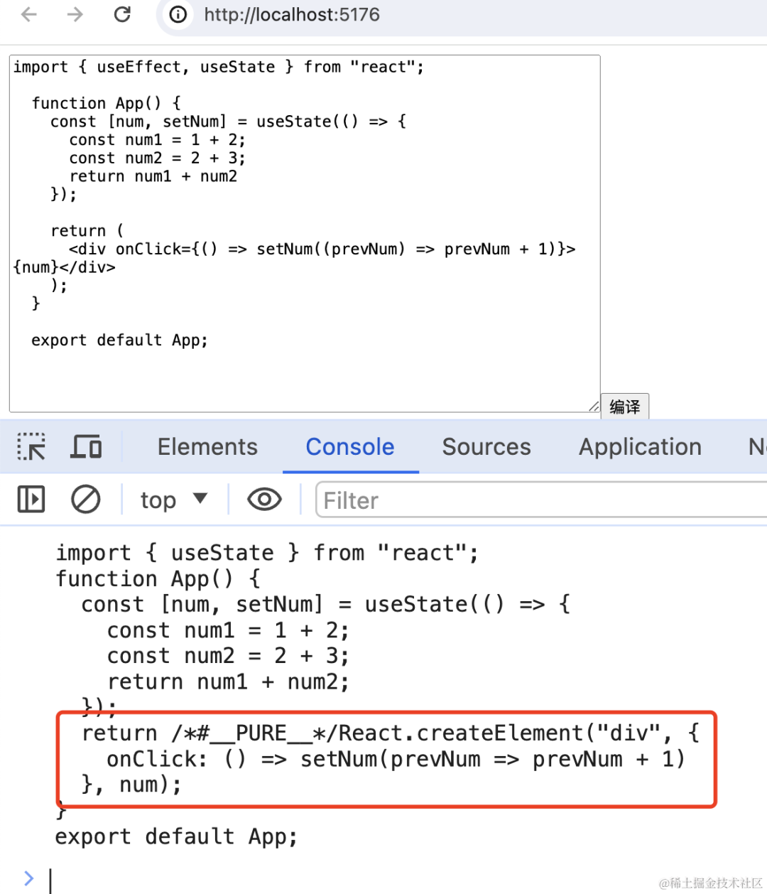 import { useRef, useState } from 'react'import { transform } from '@babel/standalone';function App() { const textareaRef = useRef<HTMLTextAreaElement>(null); function onClick() { if(!textareaRef.current) { return ; } const res = transform(textareaRef.current.value, { presets: ['react', 'typescript'], filename: 'guang.tsx' }); console.log(res.code); } const code = `import { useEffect, useState } from "react"; function App() { const [num, setNum] = useState(() => { const num1 = 1 + 2; const num2 = 2 + 3; return num1 + num2 }); return ( <div onClick={() => setNum((prevNum) => prevNum + 1)}>{num}</div> ); } export default App; ` return ( <div> <textarea ref={textareaRef} style={{ width: '500px', height: '300px'}} defaultValue={code}></textarea> <button onClick={onClick}>编译</button> </div> )}export default App在 textarea 输入内容,设置默认值 defaultValue,用 useRef 获取它的 value。