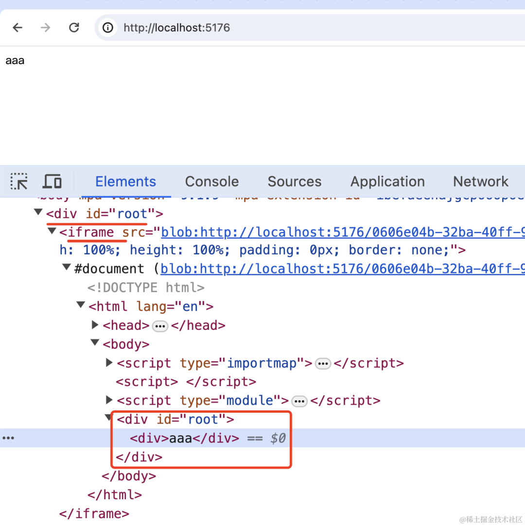 <!doctype html><html lang="en"><head> <meta charset="UTF-8"/> <meta /> <title>Preview</title> <style> * { padding: 0; margin: 0; } </style></head><body><script type="importmap"> { "imports": { "react": "https://esm.sh/react@18.2.0", "react-dom/client": "https://esm.sh/react-dom@18.2.0" } }</script><script></script><script type="module"> import React, {useState, useEffect} from 'react'; import ReactDOM from 'react-dom/client'; const App = () => { return React.createElement('div', null, 'aaa'); }; window.addEventListener('load', () => { const root = document.getElementById('root') ReactDOM.createRoot(root).render(React.createElement(App, null)) })</script><div id="root"> <div style="position:absolute;top: 0;left:0;width:100%;height:100%;display: flex;justify-content: center;align-items: center;"> Loading... </div></div></body></html>这里路径后面加个 ?raw 是通过字符串引入(webpack 和 vite 都有这种功能),用 URL.createObjectURL + Blob 生成 blob url 设置到 iframe 的 src 就好了: