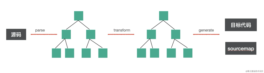 babel 编译流程分为 parse、transform、generate 三个阶段。