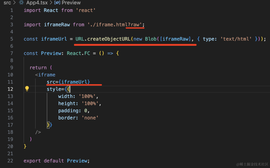 import React from 'react'import iframeRaw from './iframe.html?raw';const iframeUrl = URL.createObjectURL(new Blob([iframeRaw], { type: 'text/html' }));const Preview: React.FC = () => { return ( <iframe src={iframeUrl} style={{ width: '100%', height: '100%', padding: 0, border: 'none' }} /> )}export default Preview;iframe.html: