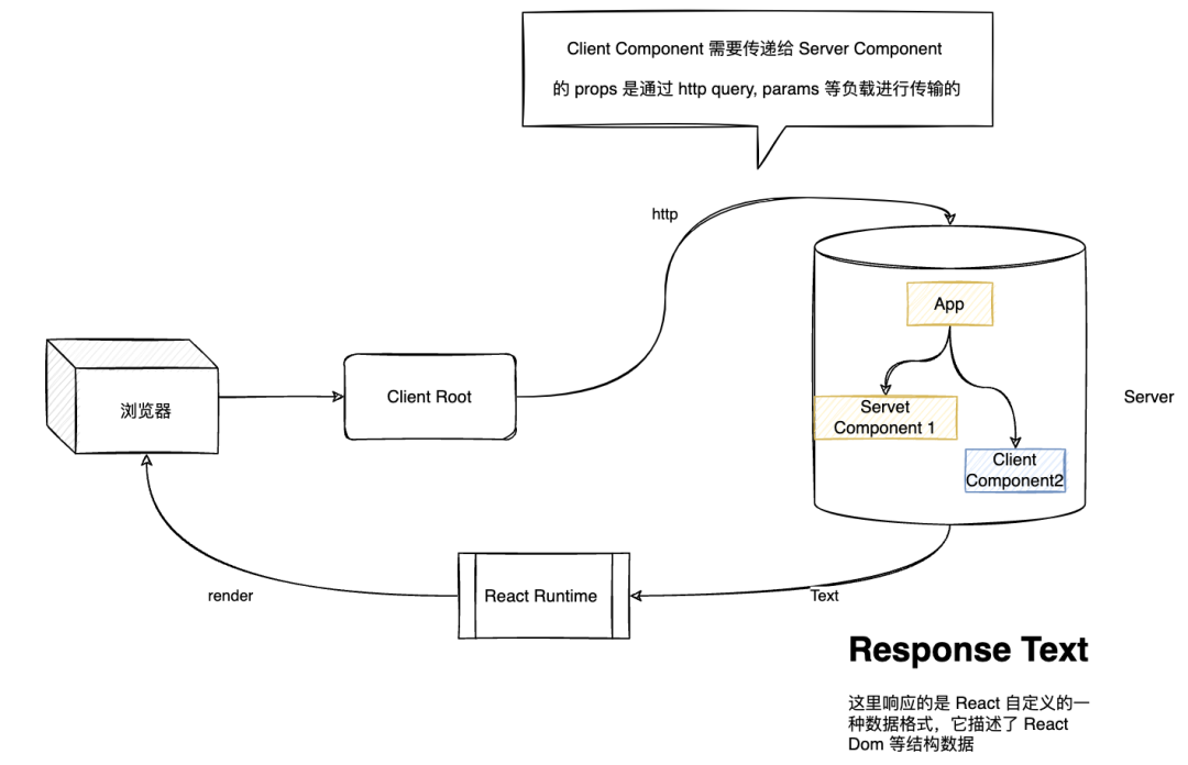 Client Component 组件通过 HTTP 向服务端组件传输信息。Server Component 通过 props 的信息接收数据,当 Server Component 拿到新的 props 时会进行重新渲染, 之后通过网络的手段发送给浏览器,通过 React Runtime 渲染在浏览器渲染出最新的 Server Component UI。
