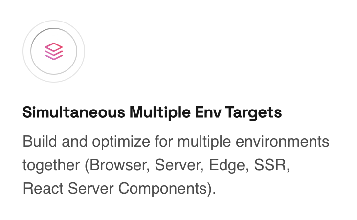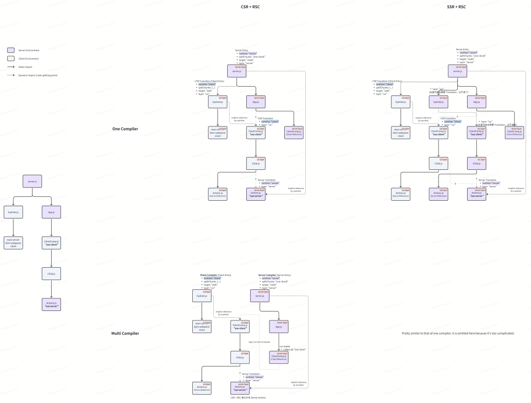 当然并不是所有的场景都适用于一次编译完成打包,对于 RSC 这种一部分模块运行在 server、一部分模块运行在 client,甚至 next.js 还有一部分 middleware 模块会运行在 server,是比较适合的;但对于 SSR 这种基本所有模块都既运行在 server 又运行在 client,就没太大必要了。