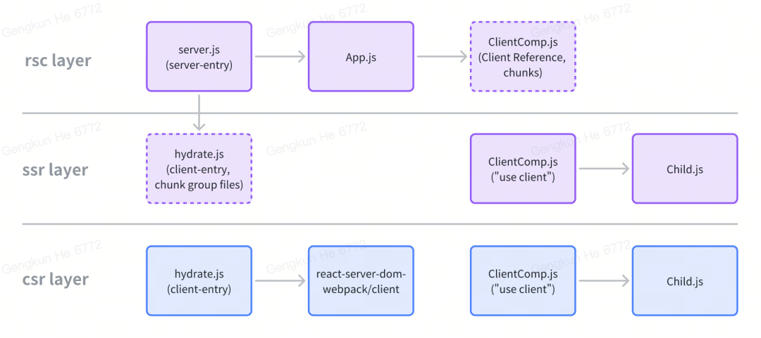 import { ClientComp } from "./ClientComp"export async function App() { return <div><ClientComp /></div> }0:"$L1"// Client Reference 渲染结果对应这条,包含一些元信息,可以通过这些元信息获得一个模块的导出变量,即 ClientComp 组件2:I{"id":"./src/ClientComp.js","chunks":["client0"],"name":"ClientComp","async":false}// 其他部分就是序列化后的 JSX1:["$","div",null,{"children":["$","$L2",null,{}]}]发送到 Client(包括 SSR)渲染这段 Server Component 结果(序列化后的 JSX)时,在遇到 Client Reference 时会通过这些元信息加载 Client 模块,首先 React 运行时会拿其中的 chunks 通过 __webpack_chunk_load__ 加载这部分被分割的 ChunkGroup,然后拿模块的 id 通过 __webpack_require__ 运行对应模块,最后拿到对应 export 的组件进行渲染即可。