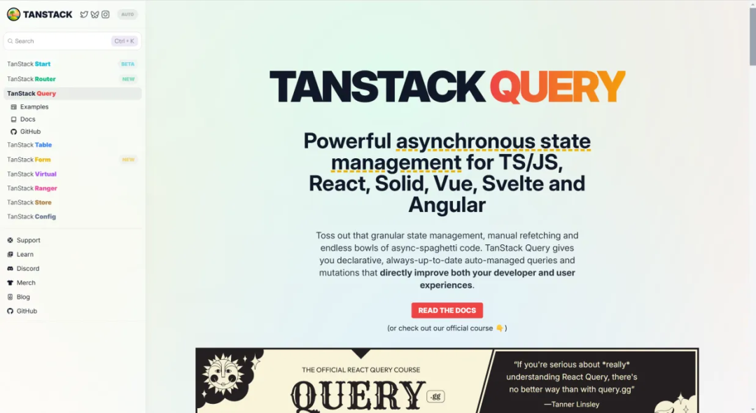 TanStack Query[11] 能处理服务器状态中所有令人头疼的问题。它可以自动刷新数据,智能缓存十分有效,轻松处理实时更新,乐观更新功能更是神奇,而且其开发工具会让你不禁感叹,要是没有它该怎么开发。