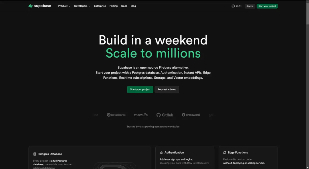 Supabase[20] 已发展成为一个功能完备的后端服务,还融入了一些很酷的 AI 特性。它具备用于 AI 相关任务的向量相似性搜索功能(vector similarity search),内置对嵌入存储的支持,甚至能将普通英文语句转换为 SQL 语句,实时订阅功能稳定可靠,还有边缘函数,方便在靠近用户的地方进行 AI 处理。