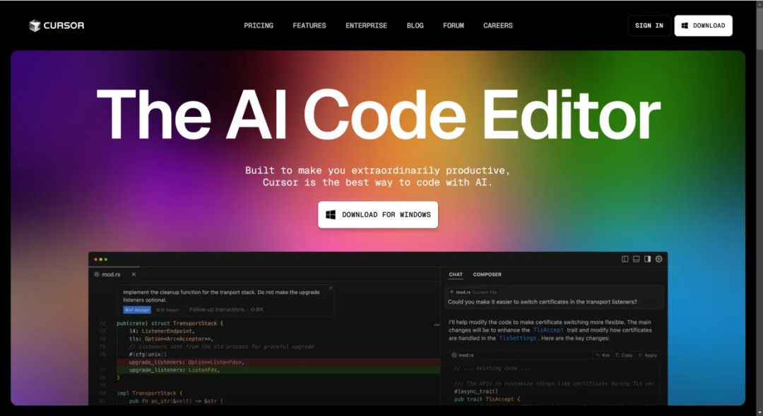 Cursor[25] 是一款旨在大幅提升开发效率的 AI 代码编辑器。它不仅能给出代码建议,还能理解整个项目。其 Tab 功能在代码补全方面犹如读心术,Command+K 组合键则如同随时待命的编码精灵。它具备智能终端、上下文感知聊天功能,甚至能用 Composer 功能生成完整的应用程序。还能索引并学习你喜爱的 React 库文档,尤其擅长生成 React+TypeScript+Tailwind CSS 代码。