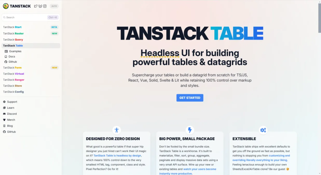 如果涉及表格相关开发,TanStack Table[17] 必不可少。它提供类型安全的表格,对于大量数据支持虚拟滚动,排序和筛选功能易用,列设置灵活,即便处理海量数据集,性能依旧出色。