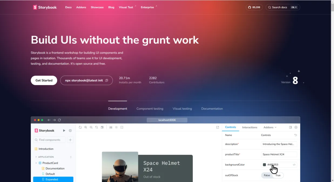 Storybook[22] 对于独立构建和测试组件至关重要。它非常适合组件驱动的开发模式,具备内置测试环境,能生成优质文档,支持视觉回归测试,还提供了便于设计师和开发者协作的功能。