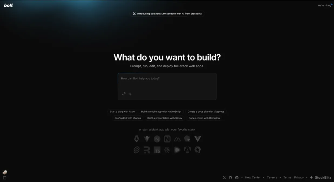 Bolt[26] 是一个基于浏览器的开发平台,功能十分强大。它能将你的描述转化为可运行的 React 应用。你只需描述想要构建的内容,瞬间就能在浏览器中得到一个全栈应用,无需搭建本地环境,也不用摆弄复杂的工具。它还有一些实用功能,比如实时预览、自动调试,并且支持一键部署到 Netlify 等平台。有了 Bolt,你可以在浏览器中完成从创意构思到应用上线的全过程。