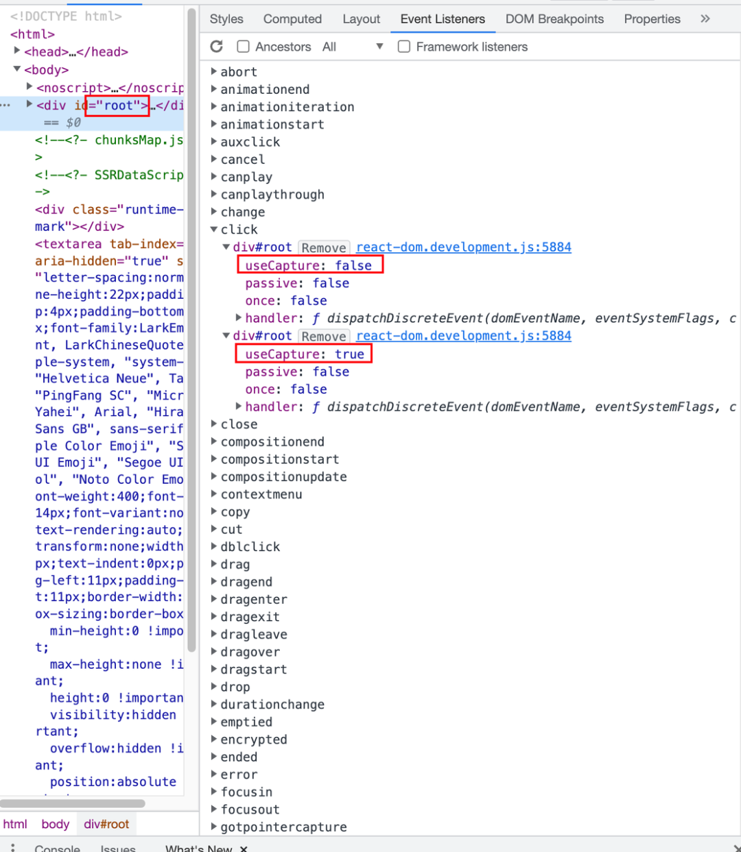 export function dispatchEvent( domEventName: DOMEventName, // 原生事件名 eventSystemFlags: EventSystemFlags, // 事件标记,如是否捕获阶段 targetContainer: EventTarget, // 绑定事件的根 nativeEvent: AnyNativeEvent, // 实际触发时传入的真实事件对象): void { //... 前三个参数在绑定到根上时已传入}// 提前绑定入参const listener = dispatchEvent.bind( null, targetContainer, domEventName, eventSystemFlags,)if(isCapturePhaseListener){ addEventCaptureListener(targetContainer,domEventName,listener)}else{ addEventBubbleListener(targetContainer,domEventName,listener)}// 添加冒泡事件监听器export function addEventBubbleListener( target: EventTarget, eventType: string, listener: Function,): Function { target.addEventListener(eventType, listener, false); return listener;}// 添加捕获事件监听器export function addEventCaptureListener( target: EventTarget, eventType: string, listener: Function,): Function { target.addEventListener(eventType, listener, true); return listener;}图示:代理事件在根元素上绑定了捕获和冒泡阶段的回调