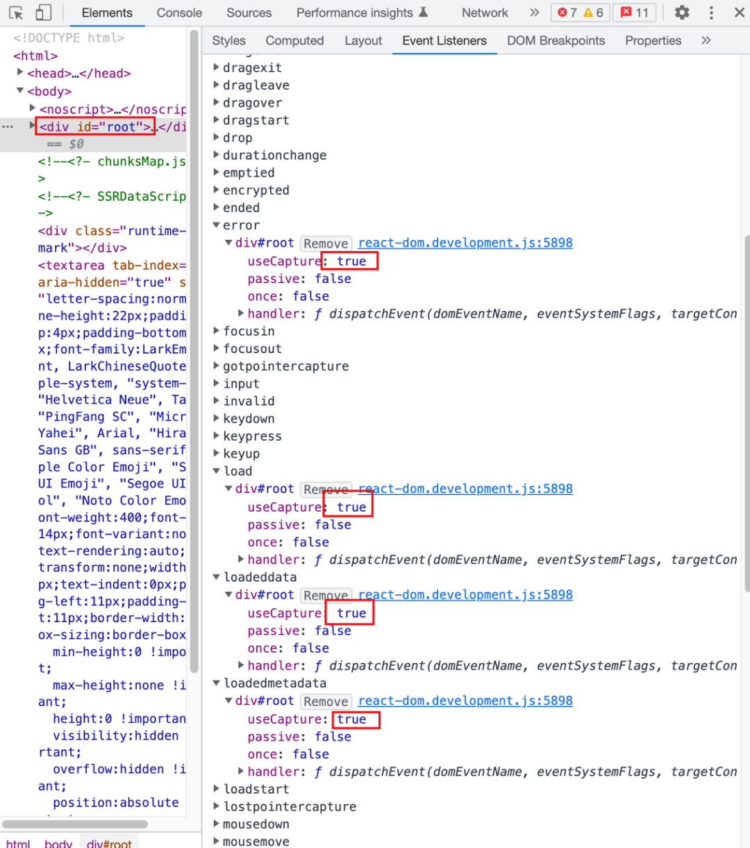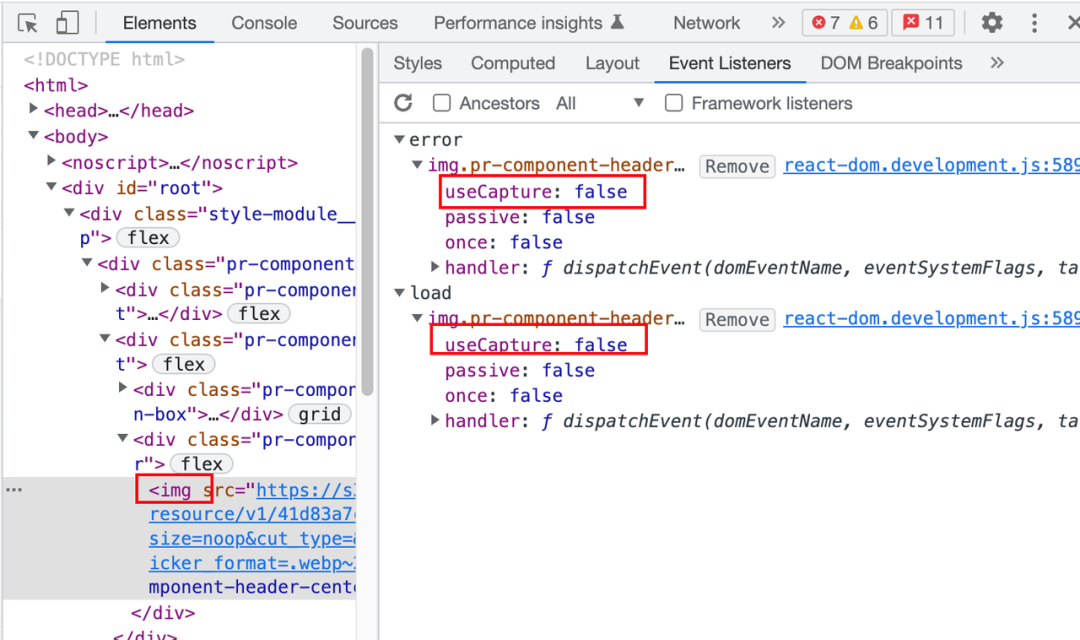 export function setInitialProperties( domElement: Element, tag: string, rawProps: Object, rootContainerElement: Element | Document,):void { // ... switch (tag) { // ... case 'img': case 'image': case 'link': listenToNonDelegatedEvent('error', domElement); listenToNonDelegatedEvent('load', domElement); break; // ... } // ...}// 非代理事件监听器绑定export function listenToNonDelegatedEvent( domEventName: DOMEventName, targetElement: Element,): void { // 绑定在目标/冒泡阶段 const isCapturePhaseListener = false; const listenerSet = getEventListenerSet(targetElement); const listenerSetKey = getListenerSetKey( domEventName, isCapturePhaseListener, ); if (!listenerSet.has(listenerSetKey)) { addTrappedEventListener( targetElement, domEventName, IS_NON_DELEGATED,// 非代理事件 isCapturePhaseListener,// 目标/冒泡阶段 ); listenerSet.add(listenerSetKey); }}图示:img元素上绑定了非代理事件error和load的冒泡阶段回调