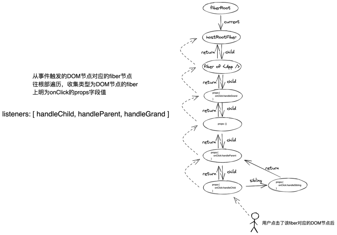 // SimpleEventPlugin.jsfunction extractEvents( dispatchQueue: DispatchQueue, domEventName: DOMEventName, targetInst: null | Fiber, nativeEvent: AnyNativeEvent, nativeEventTarget: null | EventTarget, eventSystemFlags: EventSystemFlags, targetContainer: EventTarget,): void { // 根据原生事件名拿到React事件名 const reactName = topLevelEventsToReactNames.get(domEventName); if (reactName === undefined) { // 如果是没对应的React事件就不处理 return; } // 默认的合成事件构造函数,下面根据事件名重新赋值对应的合成事件构造函数 let SyntheticEventCtor = SyntheticEvent; let reactEventType: string = domEventName; // 根据事件名获取对应的合成事件构造函数 switch (domEventName) { case 'keypress': case 'keydown': case 'keyup': SyntheticEventCtor = SyntheticKeyboardEvent; break; case 'focusin': reactEventType = 'focus'; SyntheticEventCtor = SyntheticFocusEvent; break; case 'focusout': reactEventType = 'blur'; SyntheticEventCtor = SyntheticFocusEvent; break; case 'beforeblur': case 'afterblur': SyntheticEventCtor = SyntheticFocusEvent; break; case 'click': // Firefox creates a click event on right mouse clicks. This removes the // unwanted click events. if (nativeEvent.button === 2) { return; } /* falls through */ case 'auxclick': case 'dblclick': case 'mousedown': case 'mousemove': case 'mouseup': // TODO: Disabled elements should not respond to mouse events /* falls through */ case 'mouseout': case 'mouseover': case 'contextmenu': SyntheticEventCtor = SyntheticMouseEvent; break; // ...这里省略了很多case default: // Unknown event. This is used by createEventHandle. break; } // 判断是捕获阶段还是冒泡阶段 const inCapturePhase = (eventSystemFlags & IS_CAPTURE_PHASE) !== 0; if ( enableCreateEventHandleAPI && eventSystemFlags & IS_EVENT_HANDLE_NON_MANAGED_NODE ) { // 这个分支不看 } else { // Some events don't bubble in the browser. // In the past, React has always bubbled them, but this can be surprising. // We're going to try aligning closer to the browser behavior by not bubbling // them in React either. We'll start by not bubbling onScroll, and then expand. // 如果不是捕获阶段且事件名为scroll,则只处理触发事件的节点 const accumulateTargetOnly = !inCapturePhase && // TODO: ideally, we'd eventually add all events from // nonDelegatedEvents list in DOMPluginEventSystem. // Then we can remove this special list. // This is a breaking change that can wait until React 18. domEventName === 'scroll'; // 在fiber树上收集事件名对应的props const listeners = accumulateSinglePhaseListeners( targetInst, reactName, nativeEvent.type, inCapturePhase, accumulateTargetOnly, ); // 如果存在监听该事件props回调函数 if (listeners.length > 0) { // Intentionally create event lazily. // 则构建一个react合成事件 const event = new SyntheticEventCtor( reactName, reactEventType, null, nativeEvent, nativeEventTarget, ); // 并收集到队列中 dispatchQueue.push({event, listeners}); } }}// 遍历fiber树的收集函数export function accumulateSinglePhaseListeners( targetFiber: Fiber | null, reactName: string | null, nativeEventType: string, inCapturePhase: boolean, accumulateTargetOnly: boolean,): Array<DispatchListener> { const captureName = reactName !== null ? reactName + 'Capture' : null; const reactEventName = inCapturePhase ? captureName : reactName; const listeners: Array<DispatchListener> = []; let instance = targetFiber; let lastHostComponent = null; // Accumulate all instances and listeners via the target -> root path. while (instance !== null) { const {stateNode, tag} = instance; // Handle listeners that are on HostComponents (i.e. <div>) if (tag === HostComponent && stateNode !== null) { lastHostComponent = stateNode; // Standard React on* listeners, i.e. onClick or onClickCapture if (reactEventName !== null) { // 拿到DOM节点类型上对应事件名的props const listener = getListener(instance, reactEventName); if (listener != null) { // 如果这个同名props存在,则收集起来 listeners.push( createDispatchListener(instance, listener, lastHostComponent), ); } } } // If we are only accumulating events for the target, then we don't // continue to propagate through the React fiber tree to find other // listeners. // 对于只收集当前节点的事件,收集完当前节点就退出了 if (accumulateTargetOnly) { break; } // 向上遍历 instance = instance.return; } // 返回该事件名对应收集的监听器 return listeners;}图示: