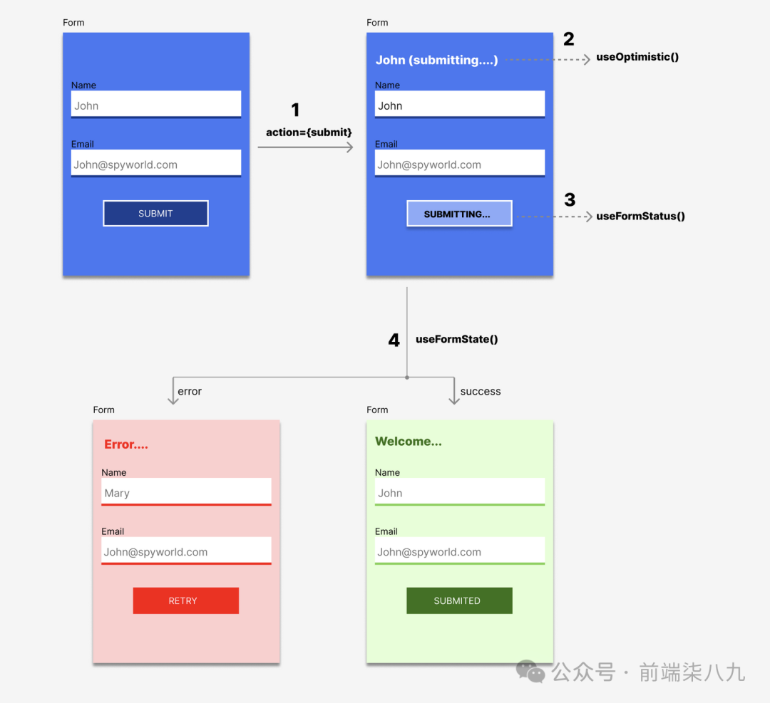 {optimisticMessages.map((message, index) => ( <div key={index}> {message.text} {!!message.sending && <small> (Sending...)</small>} </div> ))}其实,我们以后在处理类似Form表单状态时,可以配合Action/useOptimistic/useFormState/useFormState进行状态的各种流转处理。