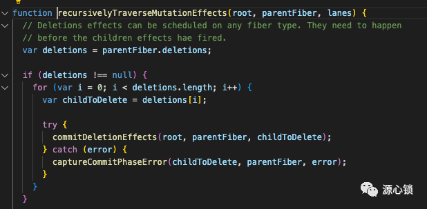 function recursivelyTraverseMutationEffects(root, parentFiber, lanes) { // Deletions effects can be scheduled on any fiber type. They need to happen // before the children effects hae fired. var deletions = parentFiber.deletions; if (deletions !== null) { for (var i = 0; i < deletions.length; i++) { var childToDelete = deletions[i]; try { commitDeletionEffects(root, parentFiber, childToDelete); } catch (error) { captureCommitPhaseError(childToDelete, parentFiber, error); } } } var prevDebugFiber = getCurrentFiber(); if (parentFiber.subtreeFlags & MutationMask) { var child = parentFiber.child; while (child !== null) { setCurrentFiber(child); commitMutationEffectsOnFiber(child, root); child = child.sibling; } } setCurrentFiber(prevDebugFiber);}image-20220913231000339