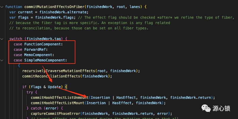 commit 第二阶段,我们会进入commitMutationEffects->commitMutationEffectsOnFiber