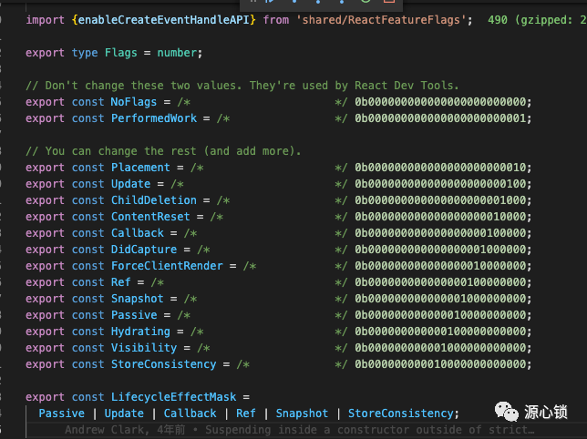const unknownFlags = Placement|Update; //此时=0b000000000000000000000110这样的好处是快,判断是否包含的时候,直接使用& 运算符,在有限的操作依据面前,使用二进制完全可以兜住所有情况。