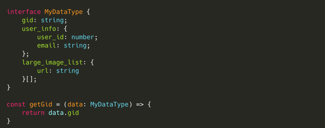 import { is } from "typescript-is"interface MyDataType { gid: number; user_info: { user_id: number; email: string; }; large_image_list: { url: string; }[];}const data: MyDataType = fetchMyData()const isRightType = is<MyDataType>(data)编译产物代码: