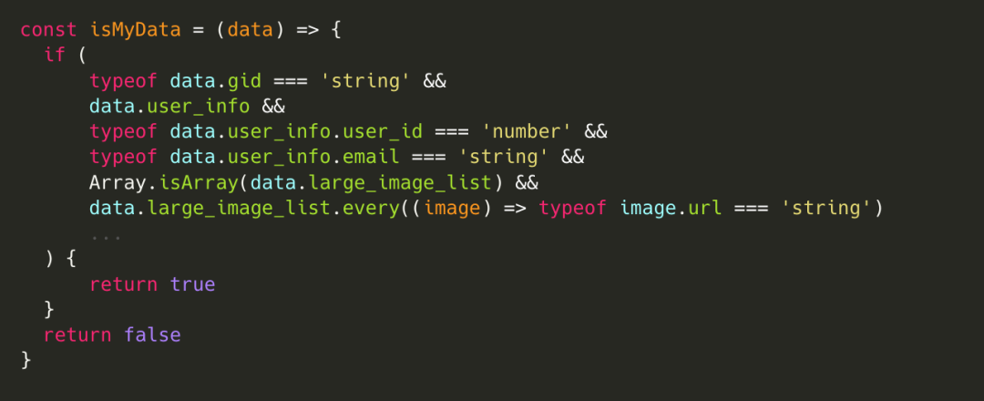 interface MyDataType { video_id: string; user_info: { user_id: number; email: string; }; image_list: { url: string }[];}const data: MyDataType = await fetchMyData()if ( typeof data.video_id === 'string' && data.user_info && typeof data.user_info.user_id === 'number' && typeof data.user_info.email === 'string' && Array.isArray(data.image_list) && data.image_list.every((image) => typeof image.url === 'string') ...) { // do something}如上,我们可以手动编写一份运行时类型检查代码,但这样写起来效率低、维护性差,而且没有用上已有的 TS 类型,导致我们要同时维护两份类型,保证之间的同步。