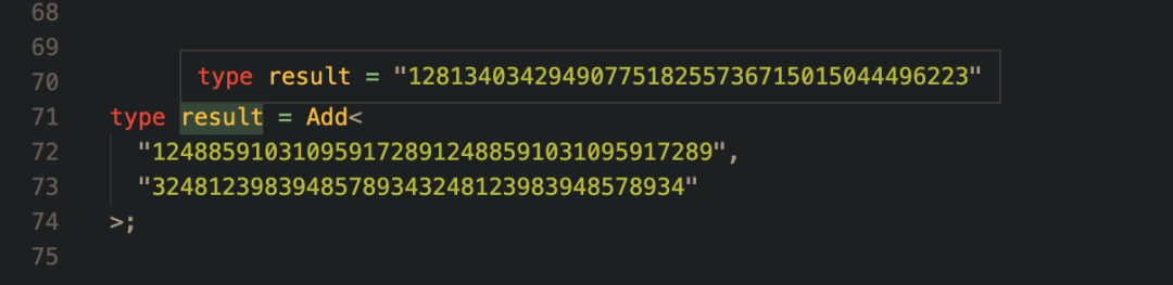 type StrDigitRangeMap = ['0', '1', '2', '3', '4', '5', '6', '7', '8', '9'];type DigitListToString<T extends any[], R extends string = ''> = T extends [infer First, ...infer Rest] ? DigitListToString< Rest, `${R}${First extends number ? StrDigitRangeMap[First] : 'n' }` > : R;type Add<A extends string, B extends string> = DigitListToString<AddDigitList<ToDigitList<A>, ToDigitList<B>>>;// debugtype result = Add< "1248859103109591728912488591031095917289", "32481239839485789343248123983948578934">;最后的处理,将 Digit[] 转为 String,看到结果顺滑的显示在我的 VSCode 提示框中,我不禁