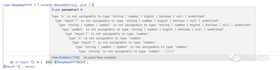 type DeepKeyOf<T> = T extends Record<string, any> ? { [k in keyof T]: k | ` ${k} . ${DeepKeyOf<T[k]>} ` ;}[keyof T] : never;- 上面的代码实际上放到 IDE 里,会提示我们这样一个错误