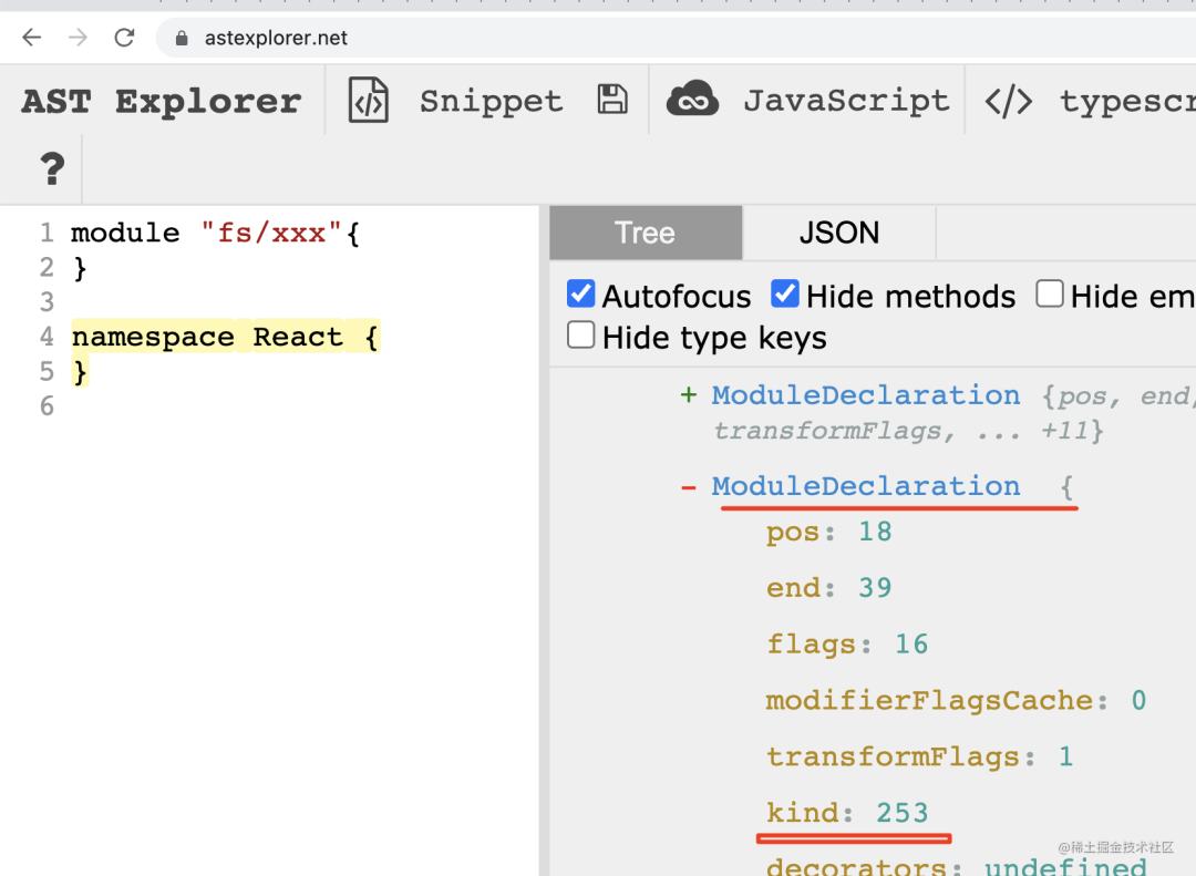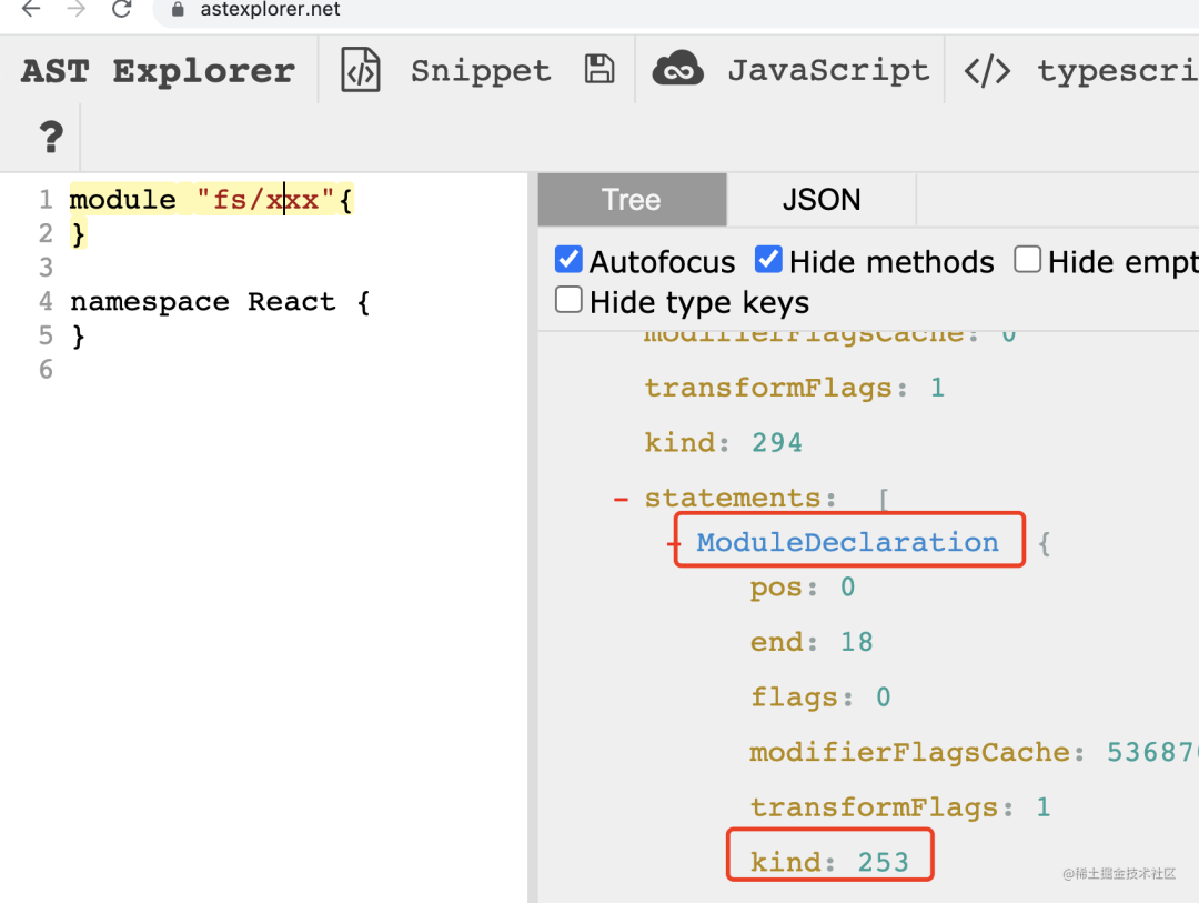 module:和 namespace 的 AST 没有任何区别,只不过一般用来声明 CommonJS 的模块,在 @types/node 下有很多