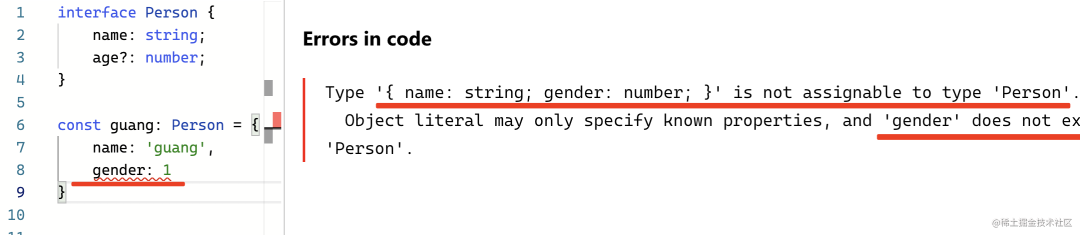 interface Person { name: string; age?: number;}const guang: Person = { name: 'guang'}比如函数: