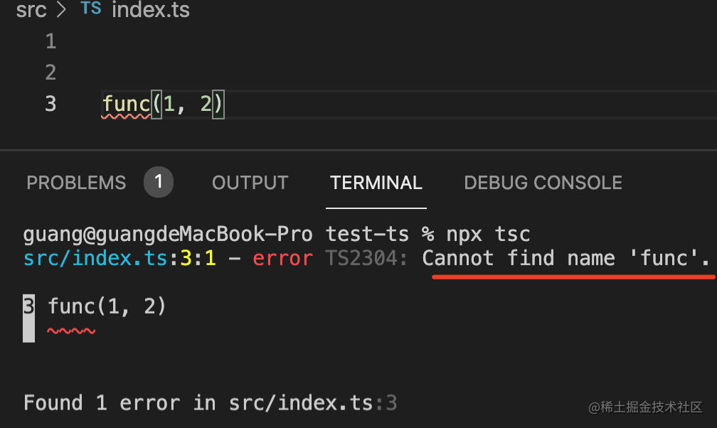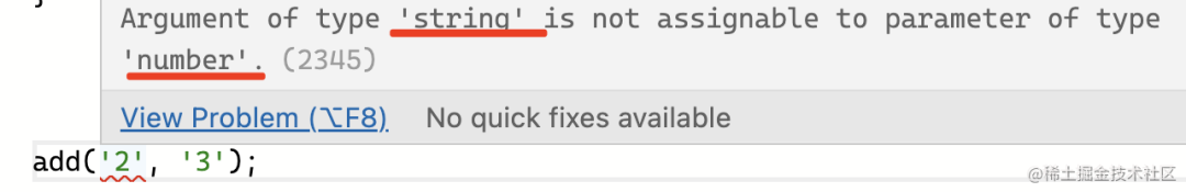 function add(num1: number, num2: number): number { return num1 + num2;}这样当使用它们的时候,比如变量赋值、函数调用,就可以通过类型信息检查出使用的对不对: